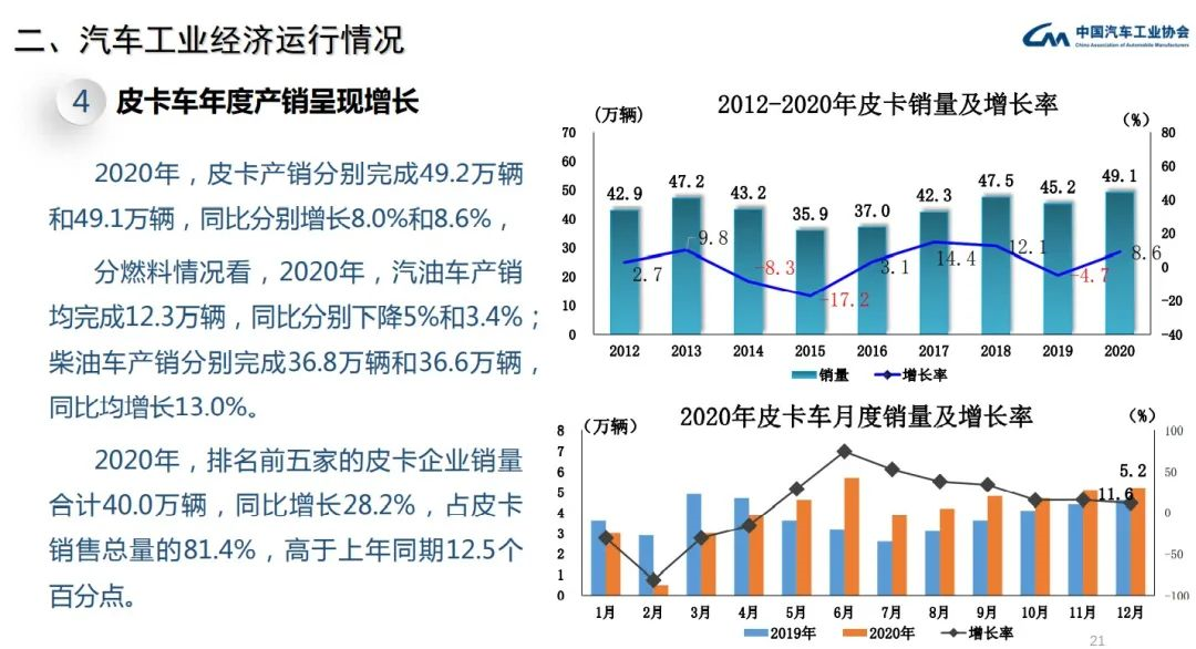 另外,中国汽车工业协会透露,2020年皮卡产销分别完成49.2万辆和49.1万辆,同比分别增长8.0%和8.6%,其中汽油车产销均完成12.3万辆,同比分别下降5%和3.4%;柴油车产销分别完成36.8万辆和36.6万辆,同比均增长13.0%。2020年,排名前五家的皮卡企业销量合计40.0万辆,同比增长28.2%,占皮卡销售总量的81.4%,高于上年同期12.5个百分点。